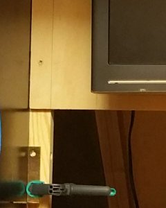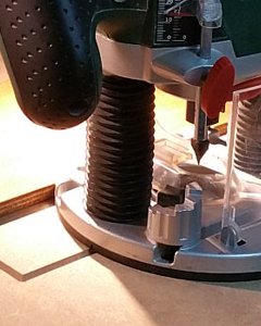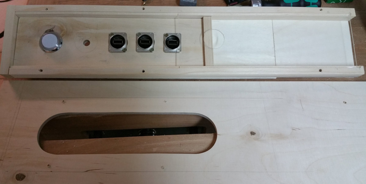 Was die Präzision der Arbeit anging, empfand ich den Einbau des Bildschrims (Controlpanel war auch nicht ohne), als den anspruchvollsten Schritt. Er sollte auf einer Multiplexplatte per VESA-Halterung exakt mittg festgeschraubt werden. Vorne sollte eine 4mm MDF-Platte passepartoutartig vorne den Bildschirm umrahmen, diese musste millimetergenau ausgefräst werden (mit V-Nut-Fräser). Die Tiefe wurde so eingestellt, dass nach der Fräsung der ausgefräste Teil einfach rausgedrückt werden konnte. Klappte alles erst beim zweiten Versuch.