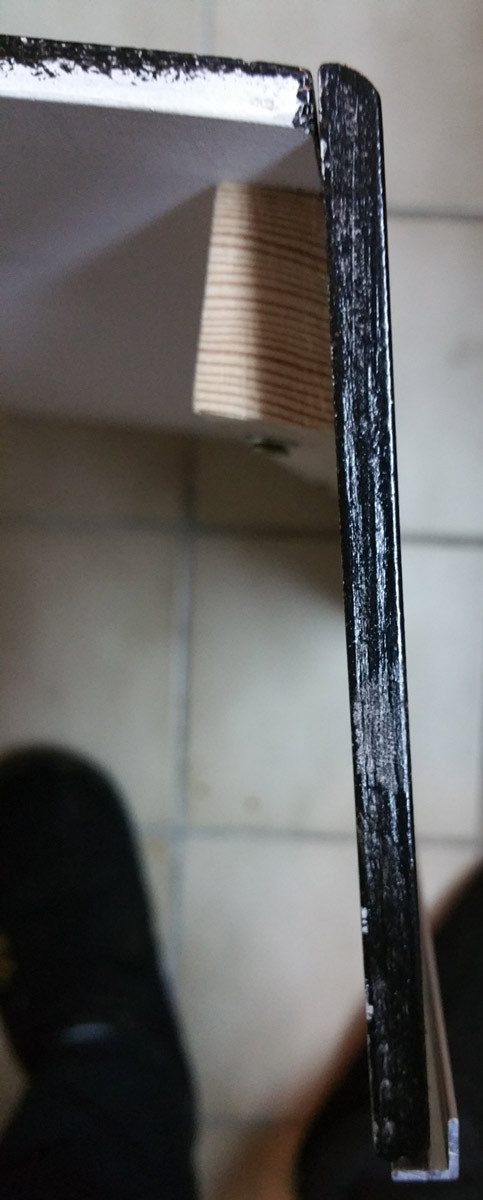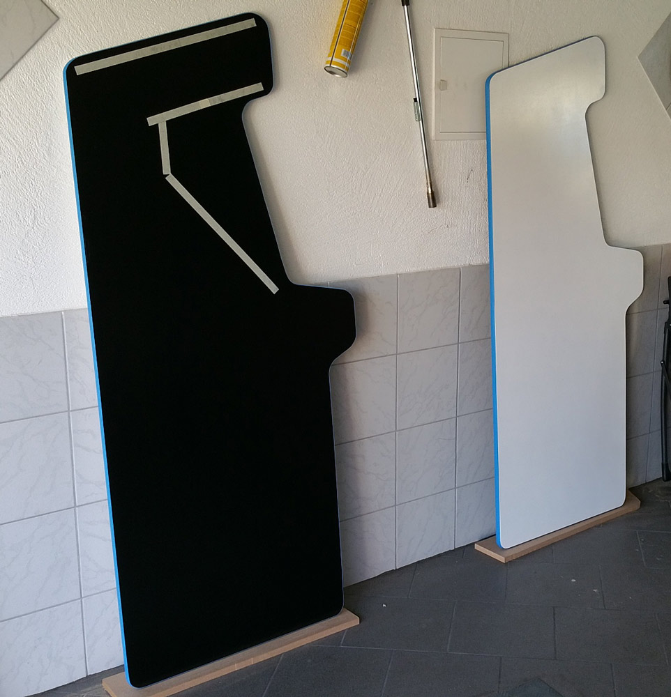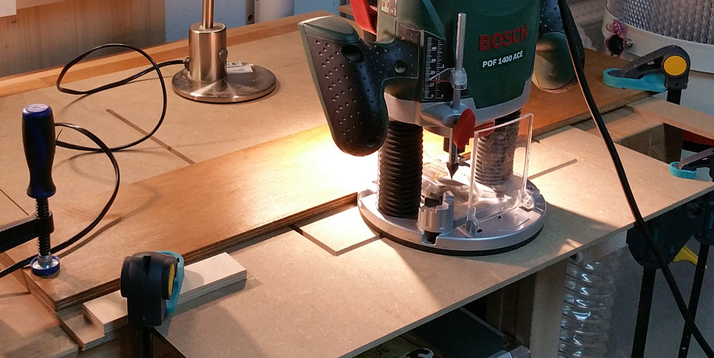 Als erstes wurden die Maße auf die MDF-Platten (Seitenteile) übertragen (je nach Vorliebe gibt es zahlreiche Originalbaupläne (hier...) im Netz, ich habe einen eigenen entworfen). Im Anschluss mit der Stichsäge aussägen. Wenn man es sich zutraut, kann man beide Platten aufeinanderlegen, mit Schraubzwingen fixieren und gemeinsam aussägen. Bei mir klappte es nicht ganz so gut wie erhofft. Im Anschluss musste ich beide mit dem Handhobel auch exakte identische Maße bringen. Für das T-MOLD (hier...) habe ich die Nut mit einem 1,5mm Scheibenfräser (hier...) gefräst. Das staubte meine koplette Garage ein. Im Anschluss daran noch grundieren und danach 2 Lagen Lack mit Rolle. Fertig