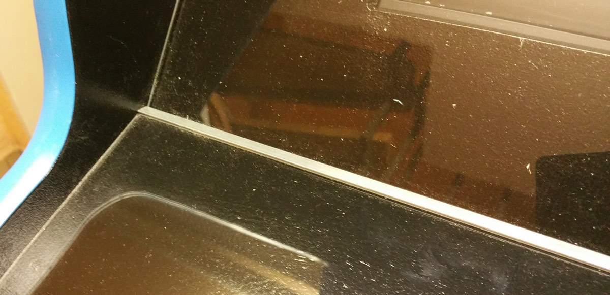 Der Marquee war nur eine Inkjetfolie zum testen der Beleuchtung. Die Lichtquelle ist eine LED Lichtleiste vom ALDI, die passt perfekt, einen gewinkelten Stecker vorausgesetzt. Der vordere Teil der oberen Abdeckung würde getrennt eingbaut und lässt ich abnehmen, um eine Art Wartungsklappe zu haben. Der Marquee besteht aus zwei Lagen Plexiglas (eins klar, eins mattiert mit Schleifpapier) er kann durch Öffnen der Klappe ausgetauscht werden.