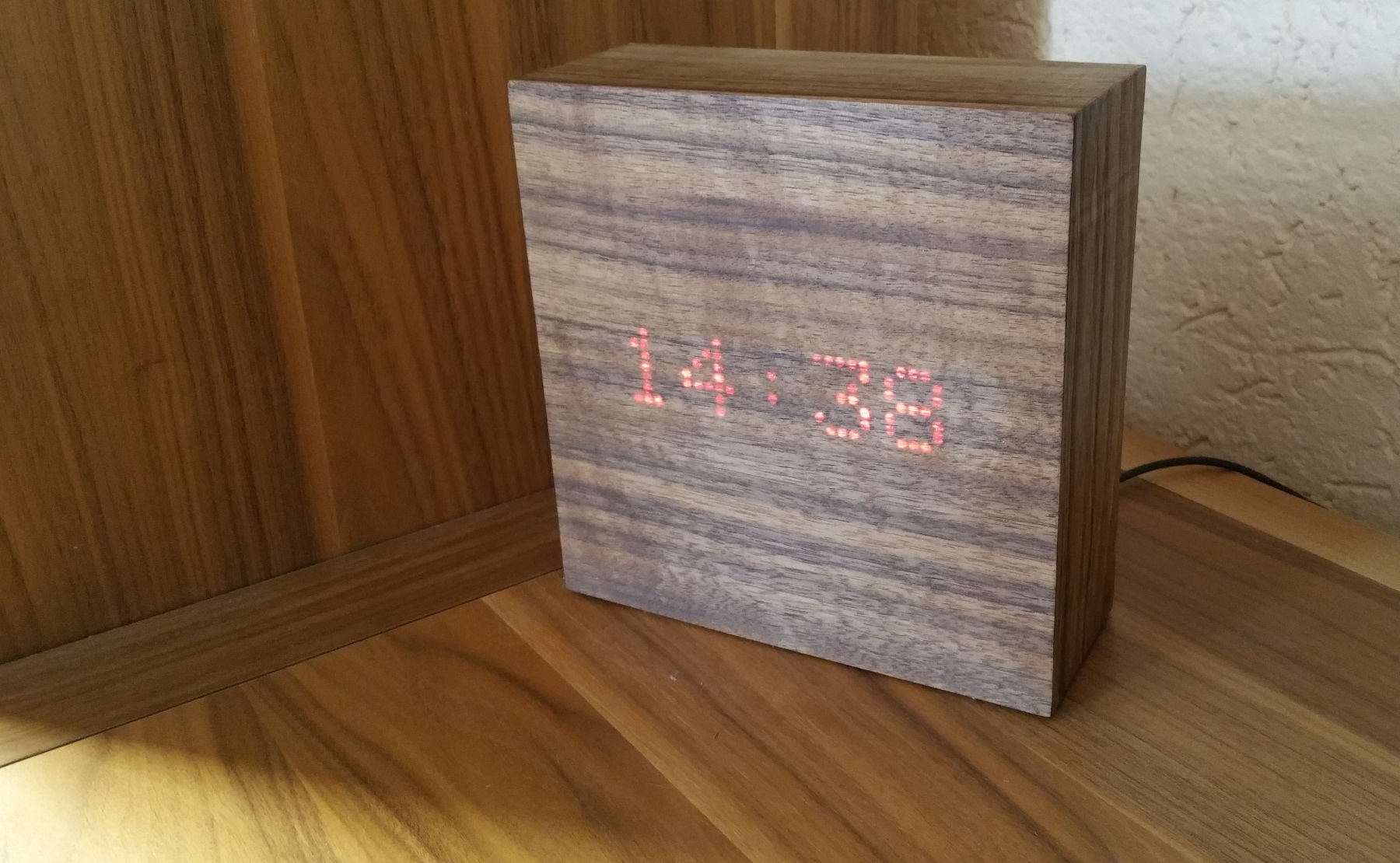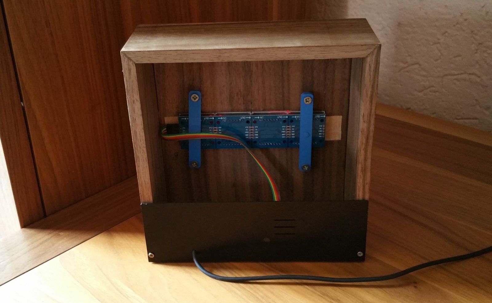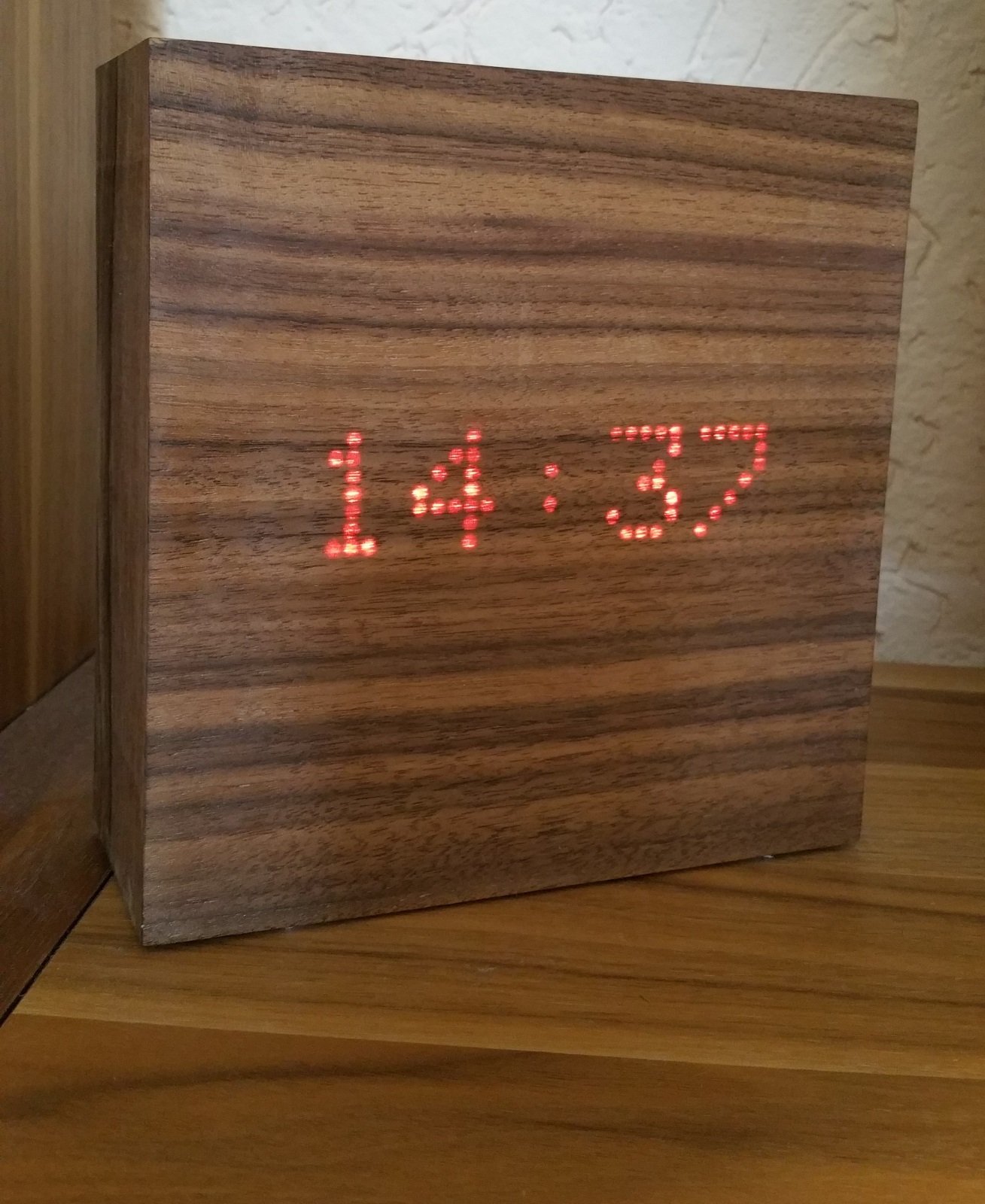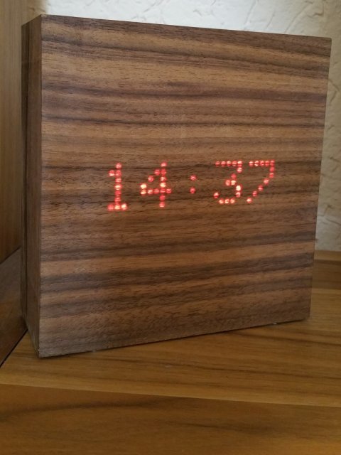 Zuerst gesehen bei "i like to make stuff" auf youtube. Hier wurde ein Bausatz in einen Holzcubus eingebaut, in ähnlicher Weise, wie ich es auch geplant habe. Nur erfüllt die Uhr nicht die entscheidende Funktion, die ich mir wünschte, denn sie läuft mit Batterie. Ich suchte eine Version mit einer Stromversorgung, die aber auch beim Aussschalten und späterem wieder Einschalten die korrekte Uhrzeit anzeigte. Nach längerem Suchen stieß ich bei "Thingiverse" auf diese Uhr hier...