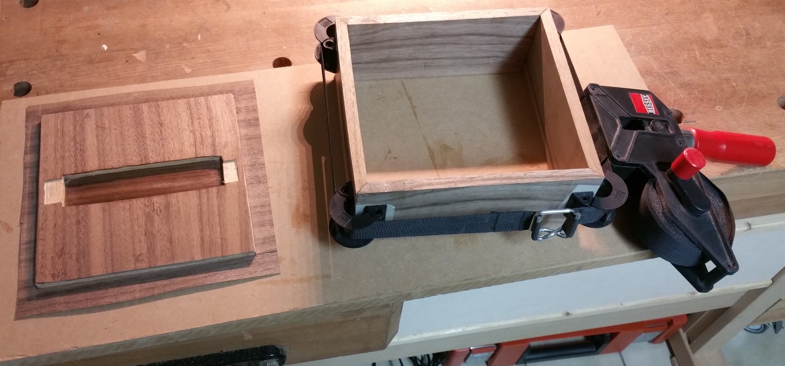 Als erstes habe ich aus Multiplex die Front mit der Aussparung für das Display zugesägt. Dieses Teil wurde dann beidseitig (muss sein, sonst verbiegt das Holz zu sehr) funiert (hier dünnes Nussbaumfurnier), innen wurde die Aussparung für das Display ausgeschnitten, außen wurde ein ca. 1,5 cm breiter Rand zugeschnitten. Der Korpus besteht aus Nussbaum. Vier Bretter gleichen Ausmaßes, wurden zu einem Korpus verleimt..