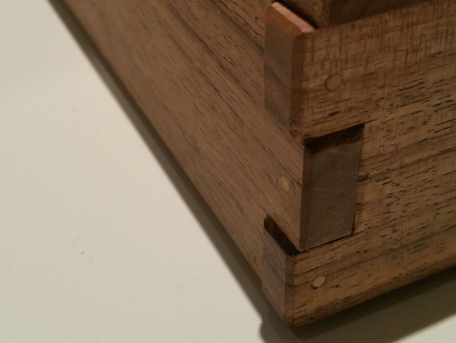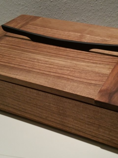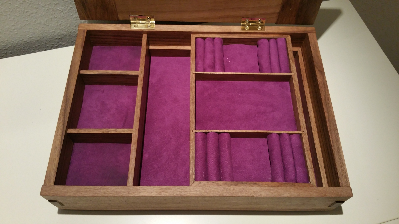 Das erst Projekt sollte eine Schmuckschatulle werden. Zuerst gesehen bei "The Woodwhisperer", alle Schritte wurden nahezu identisch, wie im Video gezeigt, umgesetzt. Der Griff wurde aus Ebenholz gefertigt, die Böden aus Multiplex und der Rest aus dem recycelten Walnussholz. Die Dübel, wie im Video gezeigt, sind aus Bambus (Schaschlikstäbchen).