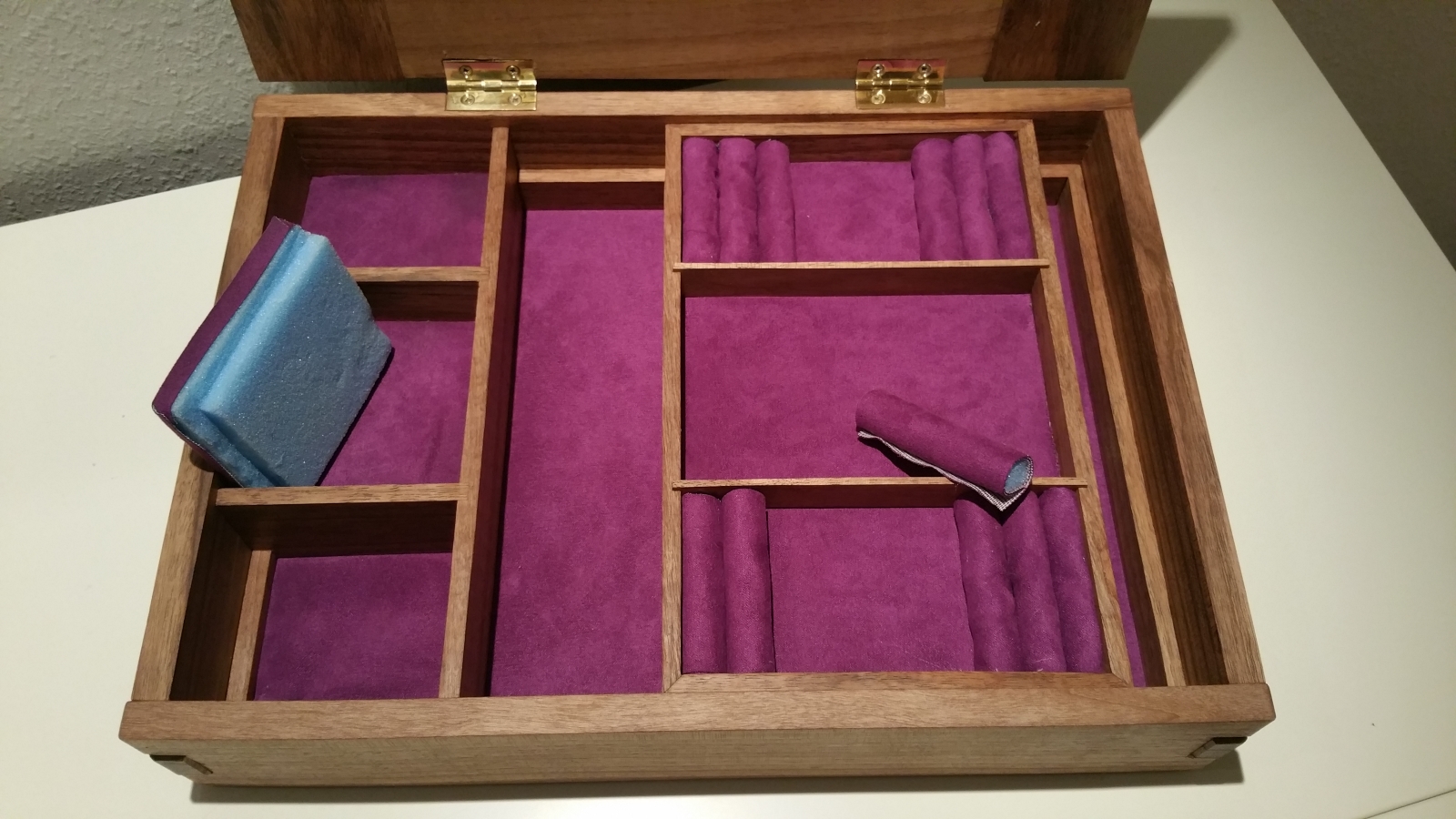 Das Innenleben besteht aus drei gepolsterten Uhrenfächern (Velours auf Schaumstoff mit Sprühkleber geklebt). Die obere Schatulle lässt sich verschieben und gibt Teile der unteren Ebene frei.